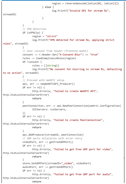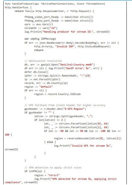 Code Citation 1: Geolocation, VPN Detection, Consent Check, and Rule Loading (excerpt from handleProducer and Helpers (~150 lines, Go))