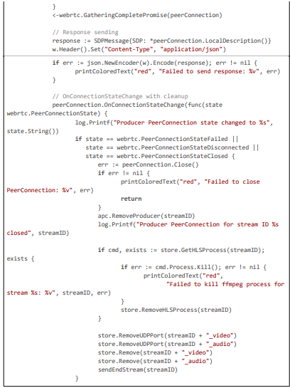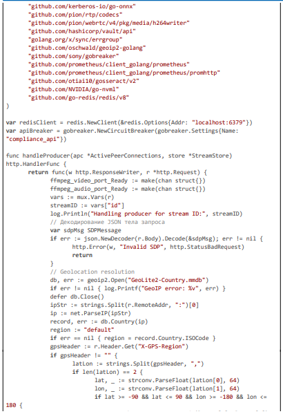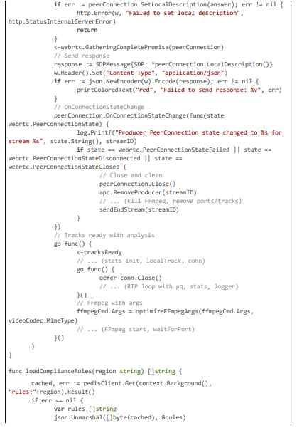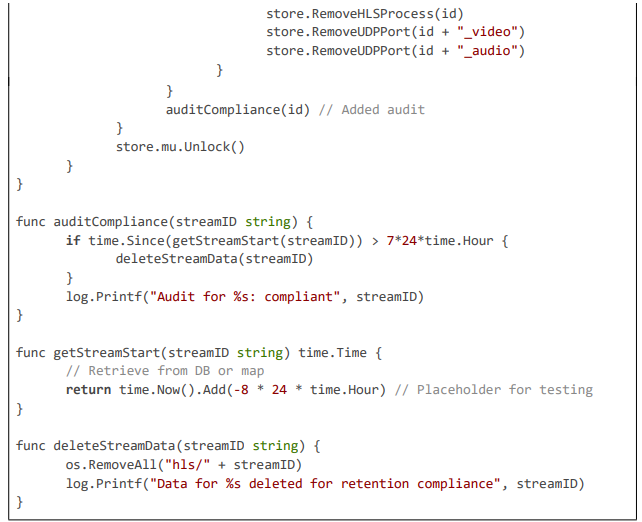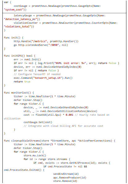 This excerpt (~80 lines) highlights latency monitoring with Prometheus gauges, GPU initialization for acceleration, and stale stream cleanup with compliance audits, ensuring efficient and legally sound operation.