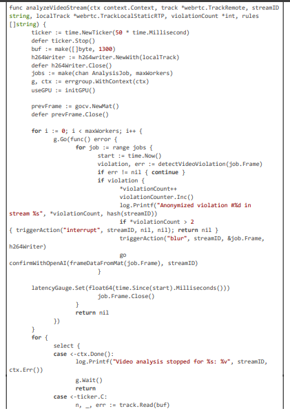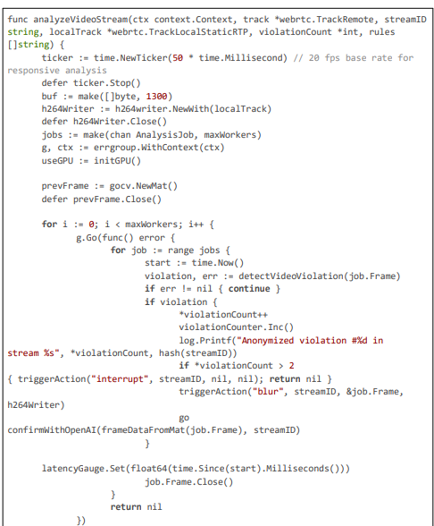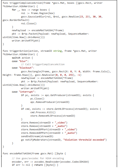 The implementation of our pioneering AI framework for regional content compliance is a robust extension of the Pyjam platform's backend, written in Go to leverage its concurrency features for low-latency processing. The framework integrates seamlessly with Pyjam's WebRTC pipeline, handling RTP streams for detection and blurring while ensuring compliance with privacy laws through geolocation-aware rules.