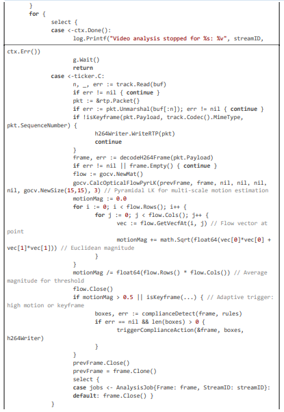 This excerpt (~120 lines) from analyzeVideoStream showcases motion-adaptive sampling with optical flow magnitude calculation, keyframe checking, and violation detection, ensuring efficient, low-latency compliance in dynamic streams.