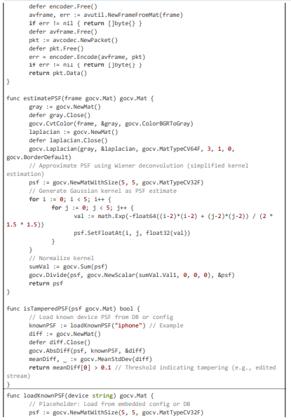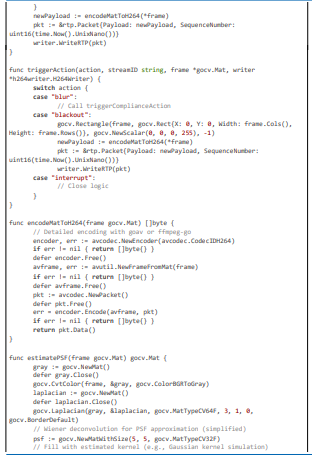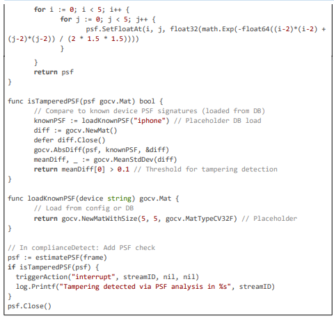Code Citation 3: Blurring, Tamper Detection, and Action Triggering (excerpt from triggerComplianceAction, estimatePSF, and related (~110 lines, Go)).