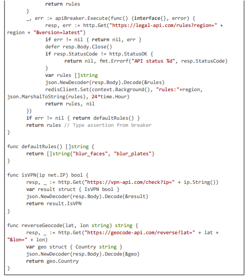 This code excerpt (~120 lines) from the handleProducer function demonstrates the integration of hybrid geolocation resolution, VPN detection, user consent checking, and dynamic rule loading with Redis caching, forming the backbone for region-specific blurring in the framework.