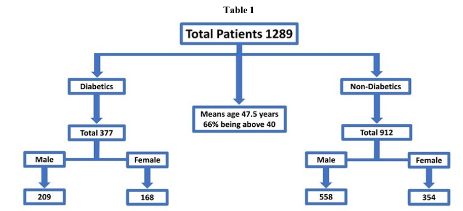 Material and Methods: All persons aged 20-70 years attending the medical camps organized in small towns near to Karachi during (2017 June-2021 June) were tested for diabetes for free with help of Sindh Graduate Association and Go Red for Women Program Pakistan Cardiac Society. Data on their age, gender, height, weight, diabetes status and blood pressure were also taken. Basal mass Index was calculated and stratified as per WHO classifications. 2120 persons were screened but complete data for 1289 persons was available for analysis.