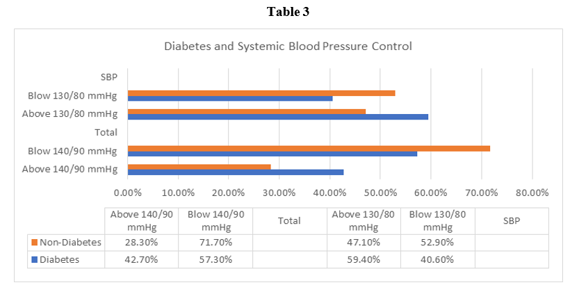 Among screened persons 32% (419) were hypertensive, 42% (161) were diabetics and 28.3% were non-diabetics. HBA1c < 7% was about 50% in persons being hypertensive in spite of the treatment when a higher threshold of 130/80 mmHg as recommended in care diabetics was used. When a BP cut off of 140/90 mmHg was used,59.4% of diabetics were found to have coexisting hypertension that was poorly controlled Table 3.