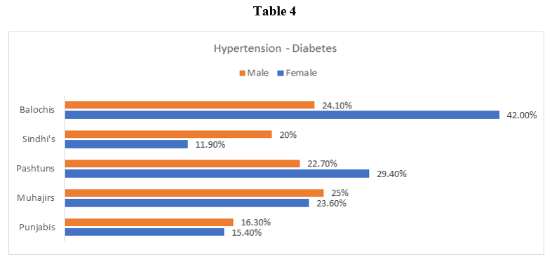 Prevalence of the Hypertension varied in the different ethnic groups and areas. The age-standardized prevalence of hypertension was highest among Balochis (25.3% in men and 41.4% in women), then Pashtuns (23.7% in men and 28.4% in women), Muhajirs (24.1% in men and 24.6% in women), and lowest among Punjabis (17.3% in men and 16.4% in women) and Sandhi’s (19.0% in men and 9.9% in women) (P = 0.001) Table 4.