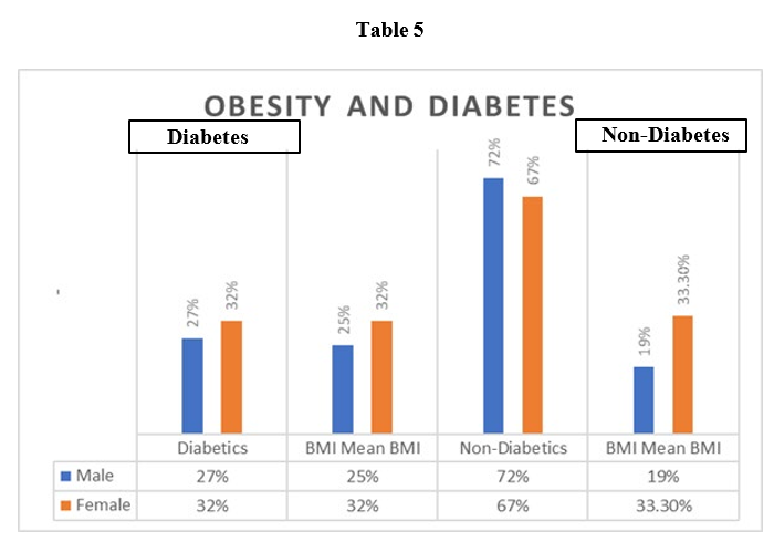 Almost two-thirds of screened patients for the Diabetes were either overweight (34.7%) or obese (29.9%). The mean BMI is among the non-diabetics was 26.75kg/m2. 58% of diabetics had a BMI of above 25 with a mean BMI of 27.13 kg/m2and in 32% diabetics BMI was above 30 kg/m2 as a measure of obesity was found in 62% of women and 52%men were either overweight or obese with 33.3% of the women. 92 (12%) were those not known to have diabetes or with impaired glucose tolerance newly diagnosed diabetics women had BMI of above 30 as compared to 19% in men. The mean waist circumference (WC) was 94.7 ± 13.3 cm; and 27.9% had central obesity (WC ≥102 cm) in screened group Table 5.