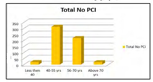 tients of <54 years of age had mild LV dysfunction then 64 (11.1%) patients had moderate LV dysfunction and 25((4.35%) with Sever LV dysfunction mostly in older women with co morbid conditions (Table 1), Revascularization with stenting was performed in 313 patients of age group 40-5o years followed by 219 patients in age group of 56-70 years in comparison to 23 in older group > 70 years and 22 in younger age < 40 years.