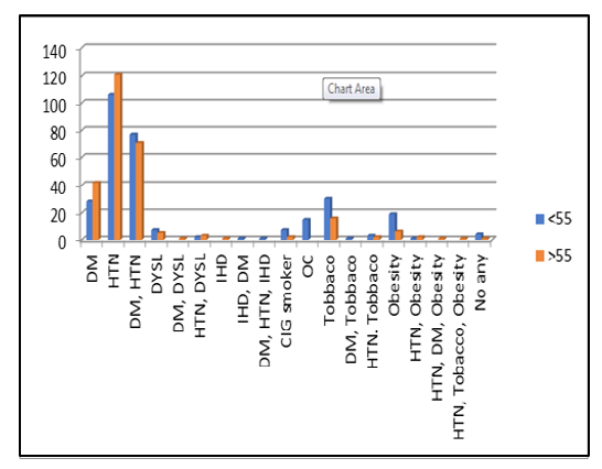 Differences in outcomes have been observed and may be explained by Vessels involved and higher prevalence of risk factors diabe- tes mellitus in 38(15.1% P<0.001). Hypertension in 138 (41.3% P=0.006) in older age group (55-69years ) and high modifiable risk factors such as smoking in 7(3.2%) ,tobacco use in 33(9.9%), obesi- ty in 19(5.7%) and oral contraceptives in15(4.2%)younger patients of age group < 54 years. (Table 4).