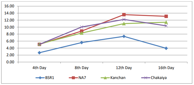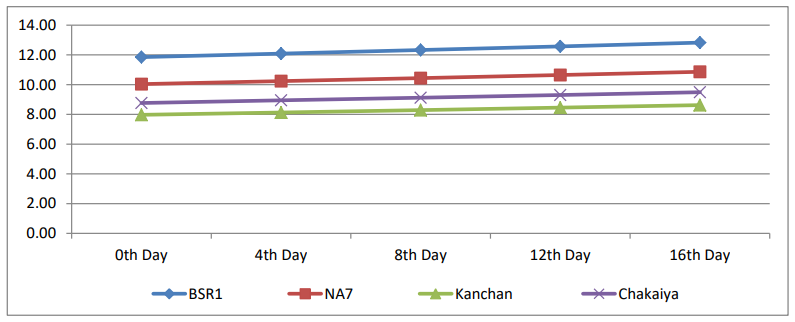 The result on ascorbic acid content (mg/100g pulp) was recorded in four varieties in different days interval at ambient temperature. Comparing the four varieties BSR1 registered higher Ascorbic acid content 499.75 mg / 100 g pulp, which was followed by NA7 (425.84 mg / 100 +g of pulp) at 16 days storage period. The Lowest ascorbic acid content registered in Kanchan 390.39 mg / 100g of Pulp at 16 days storage period.