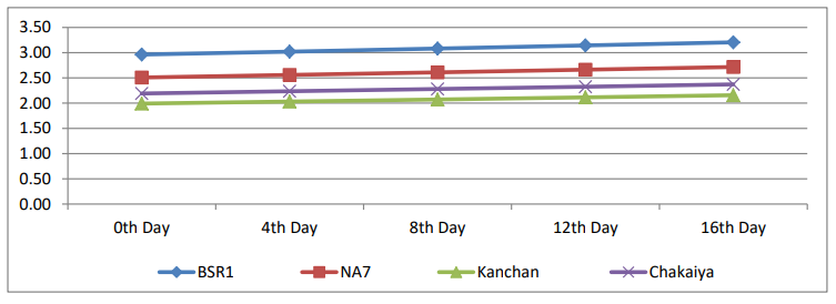 The post harvest studies on physiological loss in weight (%) were recorded in four aonla varieties. Among the different aonla varieties BSR1 registered less mean physiological loss in weight (4.26) than other anola varieties at 16 days storage period. These results were in accordance with the report of Singh and Neeraj stated that, the increased physiological weight loss in fruits must be due to various physiological mechanisms such as upsurged respiration and transpiration rate [2,7]. Among the different aonla varieties BSR1 registered less mean physiological loss in weight (4.26) which might be due to characteristics by limiting the disintegration of cytoplasmic membranes, mitochondria and endoplasmic reticulum, which results into enhancement of shelf life of aonla [8].