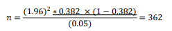 Where; n = Sample size Z = the standard normal deviation at 95% confidence interval; =1.96, P = anticipated proportion of preconception care experience among ANC attendants 38.2 % (0.382) d = margin of error that can be tolerated, 5% (0.05) Then the sample size could be calculated as: