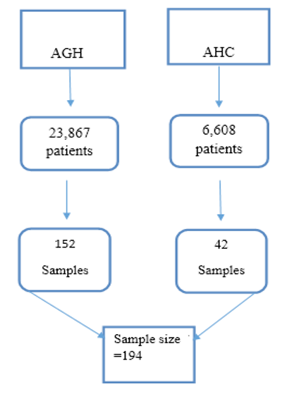 Proportional allocation was made for each health institution and quota non-probability sampling technique was used to include all patients visiting outpatient units of AGH and AHC to represent entire population of the town. Assosa general hospital and Assosa health center have 23,867 and 6,608 registered patients respectively within three months of the past year which have highest patient flow. Since 194 samples are required for this study, 152 samples from AGH and 42 from AHC were randomly selected using quo- ta nan-probability sampling method from all OPDs according to their willingness and eligibility criteria. Since all outpatients have different appointment duration, and time of this study is short, probability sampling method was not used. Prior to starting study question, the importance of the study was deeply informed and if they found difficult to participate they excluded from the study. If randomly selected patient was ineligible or not volunteer to par- ticipate, the next available patient was selected based on inclusion criteria until required sample size was met. The further illustration of used sampling methodology is shownbelow.
