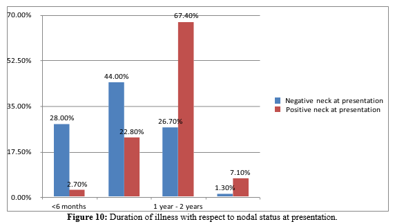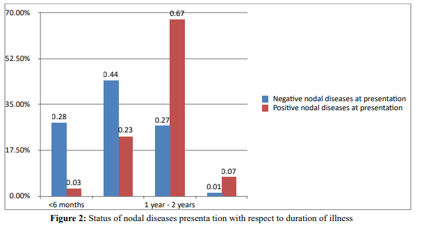 Longer duration of illness is associated with higher chance of nodal diseases at pre sentation (P<0.05).