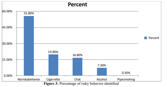 Cigarette smoking was the most common behavior identified followed by chat cheewing and alcohol use accounting for 19.8%, 16.8% and 7.3% cases respectively.