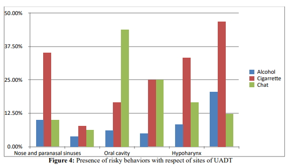 Smoking was the most common habit in patients with larynge- al (46.9%), hypopharyngeal (33.3%), nose and PNS (35%) and nasopharyngeal (7.6%) primaries. Chat cheewing was the most common in patients with oral cavity primaries (43.9%) and pa- tients with oropharyngeal SCC chat cheewing (25%) and smoking (25%) were equally identified. (P <0.05).