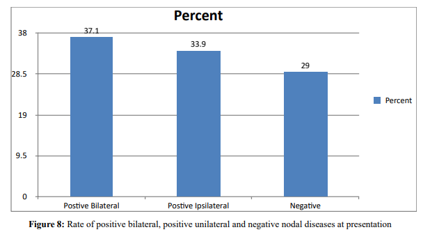 Clinically palpable node at presentation occurred in 86% of pa- tients out of which 68% had unilateral nodes and the rest 18% had bilateral. Another study by Million et al. revealed 79% of their subjects had clinically positive node at ad- mission and 15% had bilateral positive nodes. T.R. Helliwell, also showed 70% nodal metastasis at presentation with 18% of bilateral involvement [19].
