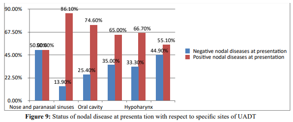 Result: A total of 259 medical records were reviewed. Mean age at presentation is 44.8. Male to female ratio is 2.6:1. Prevalence of positive nodal diseases at presentation is 71%. Site specific analysis showed 50% of nose and PNS, 86.1% nasopharyngeal, 73.2% oral cavity, 70% oropharyngeal, 66.7% hypo-pharyngeal and 57.2% laryngeal primaries had positive nodal diseases at presentation. Majority of late presentations had positive nodal diseases (p<0.05). Nasopharynx is the commonest site of primary tumor (30.5%). It is also the commonest site with higher percentage of positive nodal diseases (86.1%). Most patients had advanced stage at presentation (cTNM stage III and IV- 88.1%). Distant metastasis was found in 10.8% of patients and had strong association with T stage (p<0.05).