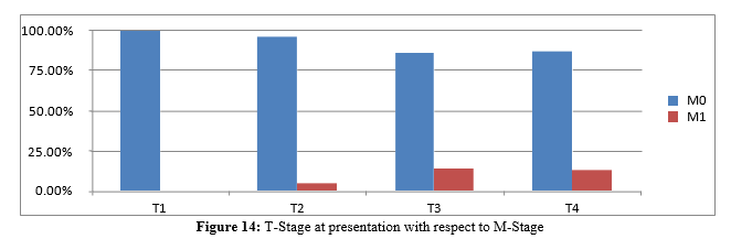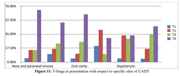 Overall analysis of T stage disease showed majority of patients come with advanced T4 and T3 diseases 49.4% and 24.7% respectively. Likewise, primary site-specific results showed advanced T stage at presentation (p<0.05).