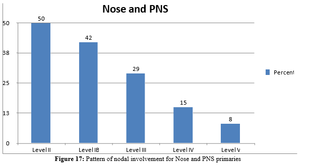 Prevalence of positive nodal diseases for nose and PNS primaries was 50%. This result is significantly higher when compared with findings from a couple of literatures cited. Only 2.3% of patients were found to have positive nodal at presentation even though all participants had T3 and T4 diseases. Chances of having positive nodal disease were 1.6% and 10% for ethmoid and maxillary sinus SCC [26]. Only 29% of their patients had positive cervical nodal disease at presentation despite 75% had T3 and T4 diseases at pre- sentation [24]. Having positive nodal dis- ease at presentation is a rare encounter occurring in only 4% of cases. Having such a signif- icant proportion of patients with positive nodal diseases, where the rule elsewhere is advanced T stage with rare nodal disease can’t be sufficiently explained by only late presentation and further study should be pursued to study the Im pact of genetics, environmental factors, sun-cite and histologic type analysis. Pattern of nodal in- volvement is consistent with other literatures.