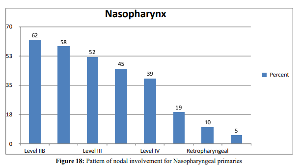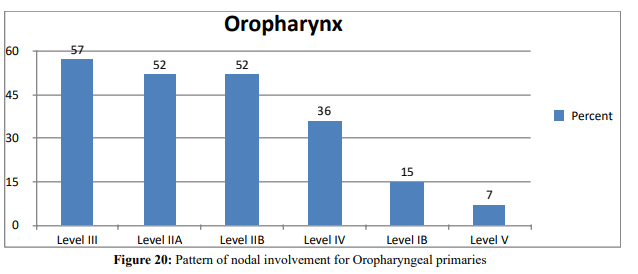 Another retrospective medical record review of 333 patients with oropharyngeal and hypopharyngeal primaries and showed a preva- lence of positive neck disease at initial visit to be 84%. This review also depicted the overall of occurrence of positive nodal diseases in level II, III and IV to be 25%,19% and 8% respectively and in- volvement of level I and V is rare and always found only with the involvement of most frequent levels [13].