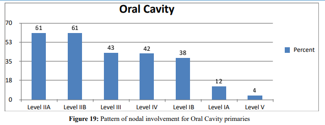 Location, pattern and incidence of metastasis from Oral cavity SCC vary according to the respective sub sites even though most tumors from these subsites typically drain to level I, II and III cer- vical nodes and there is a high tendency of bilateral nodal involve ment for midline lesions. Tumors that are 1cm away from mid line has lower tendency of contralateral nodal involvement [5]. Sublev- el IIB involvement was also demonstrated in 10% of patients with OC SCC [7]. Tumor thickness and ad vanced T stage are reliable indicators of nodal involvement [5].