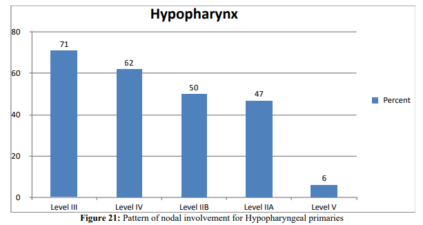 Various studies depict the most likely involved lymph node levels and there are appar ent differences in pattern and frequency among the three subsites of hypo pharynx. Primaries of pyriform sinus frequently goes to level II, III and IV, post cricoid tumors goes to level II, III and paratracheal nodes whereas 40% patients with primaries arising from posterior pharyngeal wall had metastasis to retropharyngeal lymhnodes T.R. Helliwell [19]. In their study of pyriform sinus SCC Nishi et.al. found that almost all cervical nod- al metastasis was confined to level II and III nodes. Level II lymph nodes are the most involved groups followed by level III and IV and involvement of level V is always associated with nodal me- tastasis at other sites. Candela et. al [13]. Level VI nodal involve- ment is usually seen in advanced tumors arising from post-cricoid and pyriform apex areas or lower pharyngeal areas. Timon, et al. Lindberg in their study conducted in 1155 patients with SCC of upper aerodigestive tract and positive node at presentation depict- ed that bilateral nodal involvement for pyriform sinus tumors is rare [6,16].