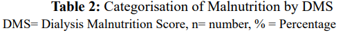 As indicated in Table 2, 78.5% of patients (n=51) were categorised to have mild to moderate malnutrition based on dialysis malnutrition score. No patients were diagnosed with severe malnutrition category. Fourteen (21.54%) patients were categorised as well nourished.