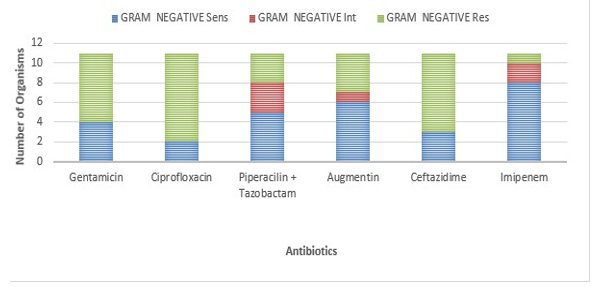 As shown in Figure 1, Imipenem was the most susceptible antibacterial, followed by Augmentin to all gram-negative isolates in the study.