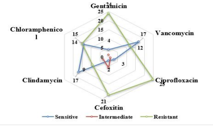 As shown in Figure 3, Vancomycin and clindamycin was the most susceptible antibiotic to Staphylococcus Aureus.