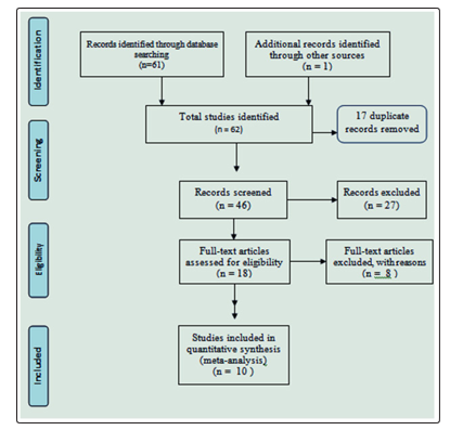 Study Selection About 61 published articles and 1 unpublished study were found in the review. Then we removed 17 duplicate records and excluded 27 records by title and abstract after screening. A total of 18 full-text articles were screened for eligibility. Finally, 10 articles were selected for systematic review and meta-analysis and the rest 8 articles were excluded by eligibility criteria