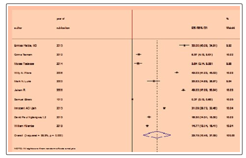 Six cross-sectional studies, two cohort studies, one case control study and one clinical trial were included in this review [16,24-30]. All the articles included were published studies and the sample size ranged from a minimum of 154 studies conducted in Ethiopia to a maximum of 2589 studies conducted in sub-Saharan Africa [24,30]. The final review included a total of 16,296 participants. The studies were carried out in different countries in Africa between 2003 and 2015. Three studies have been conducted in Ethiopia from selected articles three studies in South Africa, two studies in Uganda, three studies in Nigeria, Tanzania and SSA, one in each country [16,18,24-30] (Figure 1).