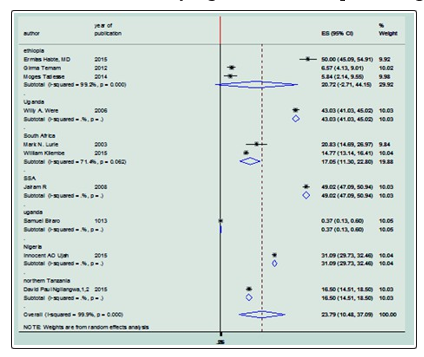 Results: Ten studies met the inclusion criteria and were included in the Meta - analysis. The findings of these 10 studies revealed that there was 23.77 (95 percent CI: 10.48, 37.09) pooled prevalence of sero discordance. The highest prevalence of HIV sero discordance was found in Uganda and SSA OR: 49.2 (95% CI = (47, 50.9) and OR: 43 (95% CI = (41, 45) respectively.