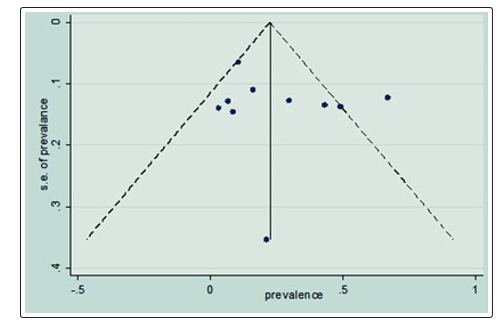 Figur 3: Funnel plot with 95% confidence limit of the pooled meta-analysis of the prevalence of HIV sero discordance, 2019