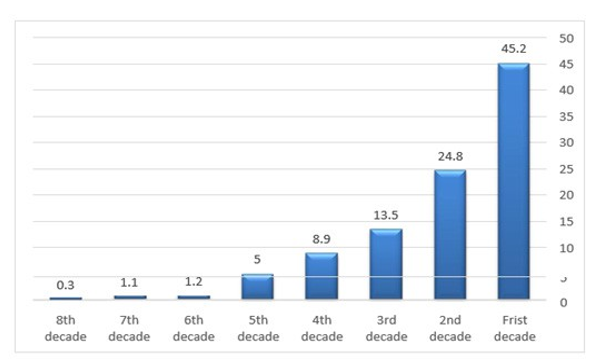 Our findings demonstrate a distinct age-related pattern in first- seizure onset. The highest risk (45.2%) is concentrated within the first decade of life. This is followed by a decrease, with a secondary peak observed in the second decade (24.8%). Subsequently, the incidence of first-time seizures steadily declines throughout adulthood (13.5% in third decade, 8.9% in fourth decade, and 5% to 0.3% from fifth to eighth decades).