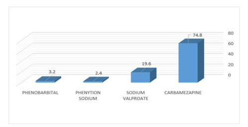 As shown in [Table 4], In our investigation into epilepsy treatment, carbamazepine stood out as the most frequently employed medication, accounting for a significant 74.8% of cases. Sodium valproate followed at a distant second with 19.6%, highlighting a clear preference for carbamazepine within the studied population Notably, phenobarbital and phenytoin sodium usage trailed considerably behind at 3.2% and 2.4% respectively, suggesting a potential shift towards carbamazepine as the primary therapy.