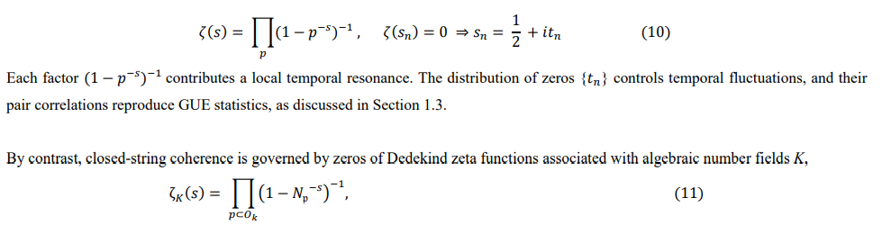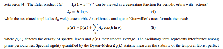 Each factor (1 − p−s )−1 contributes a local temporal resonance. The distribution of zeros {tn} controls temporal fluctuations, and their pair correlations reproduce GUE statistics, as discussed in Section 1.3.