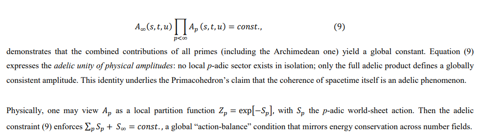 2. The adelic product (Equation 9) enforces global consistency, mirroring spacetime coherence;