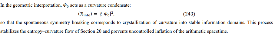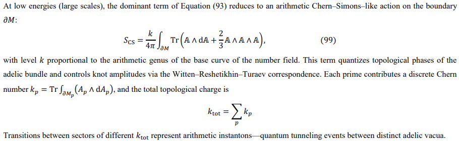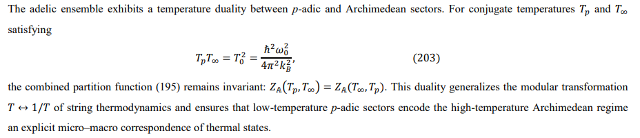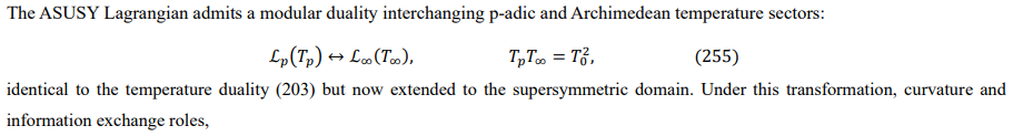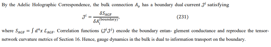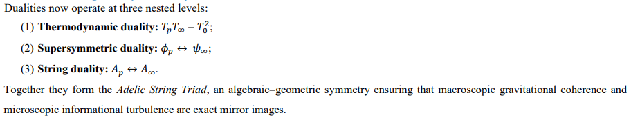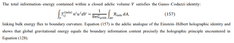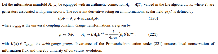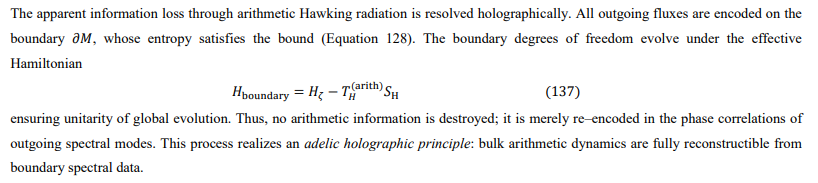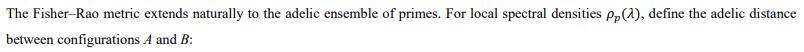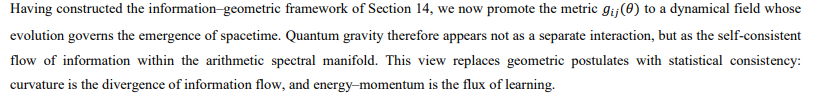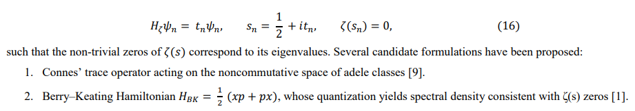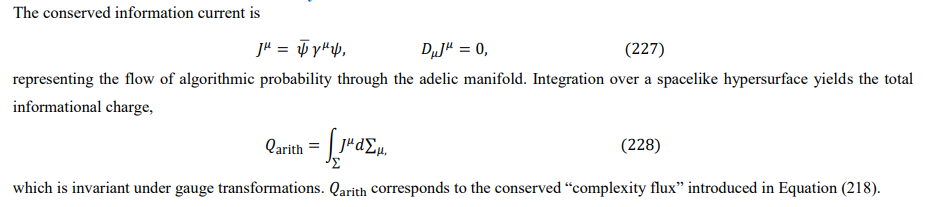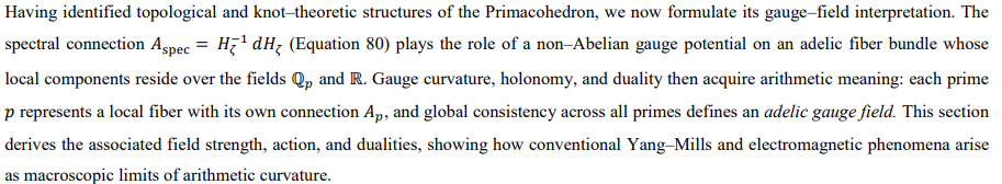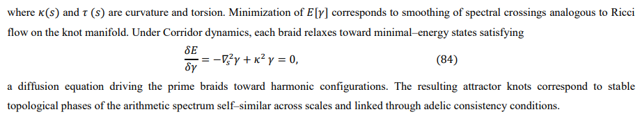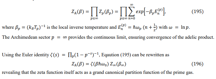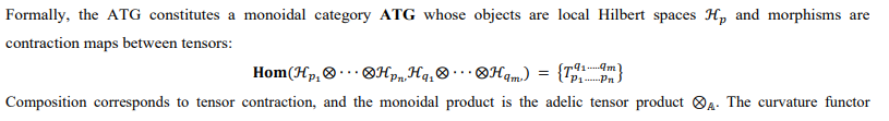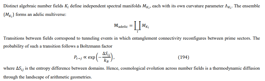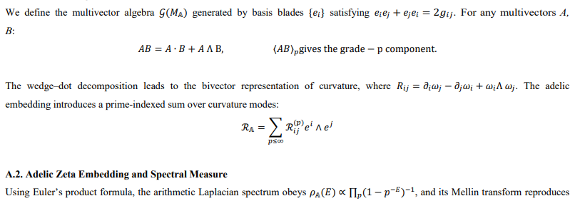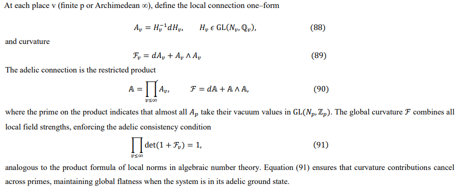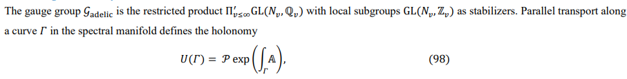 establishes that coherence across all primes enforces global consistency of spacetime. Each prime hence acts as a topological patch or plaquette, and the adelic product guarantees smooth gluing of curvature across these patches. The Langlands correspondence provides the abstract algebraic underpinning of this —arithmetic geometry of time,|| identifying automorphic representations with spectral data of H£.