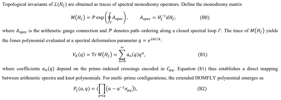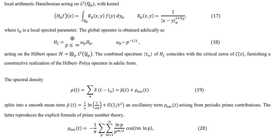 which demonstrates that the zeros encode all prime periodicities. Equation (20) thus provides the analytic backbone of the Primacohedron: primes and spectral lines are conjugate variables in a Fourier-type duality.