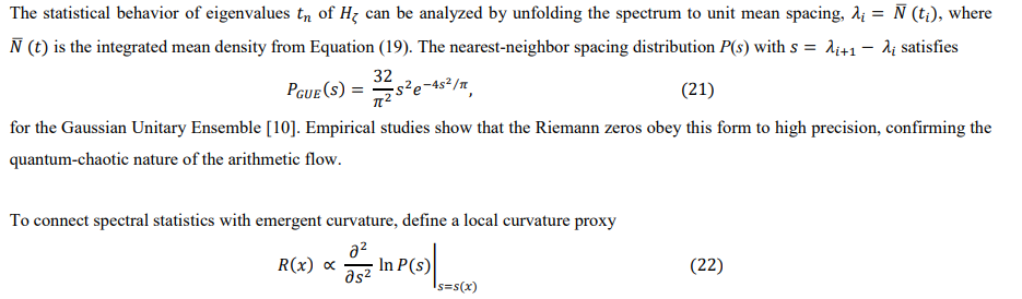 correlator and thus encode deviations from GUE spacing. In this way, spectral geometry replaces Riemannian geometry: curvature is not a differential property of a manifold but a second-order moment of the eigenvalue distribution.