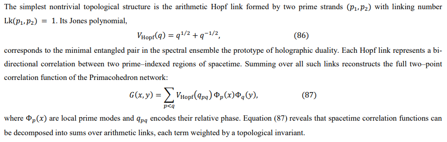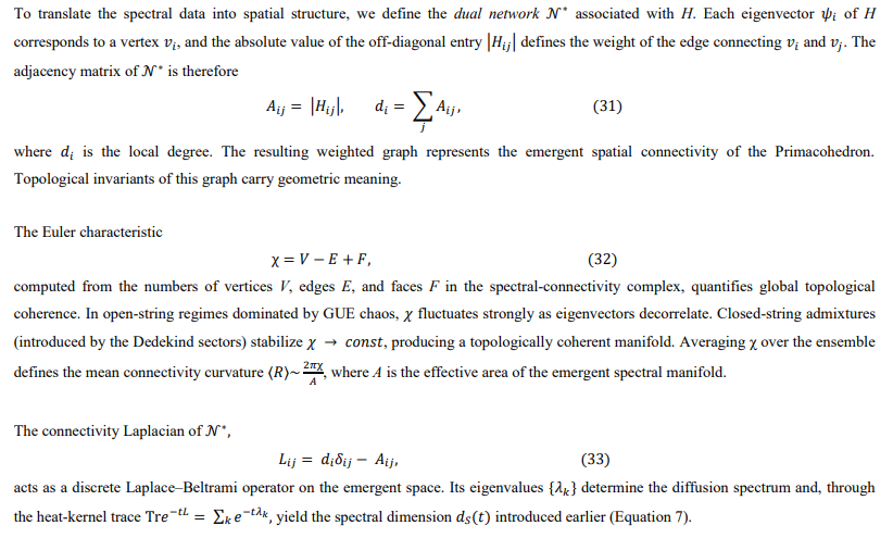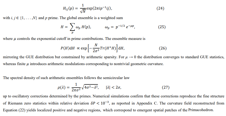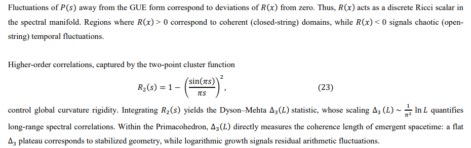 (3) Random-matrix universality ⇒ macroscopic spacetime regularity. In this unified picture, number theory, quantum chaos, and geometry are not separate disciplines but complementary projections of a single spectral object the Primacohedron whose vertices are primes, whose edges are spectral correlations, and whose higherdimensional faces encode the emergent continuum of spacetime.