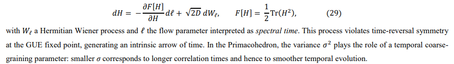 (1) The random-matrix ensemble (30) encodes prime-weighted temporal fluctuations and generates an intrinsic arrow of time;