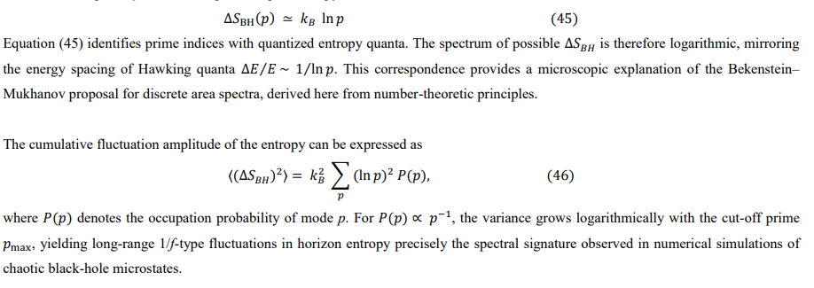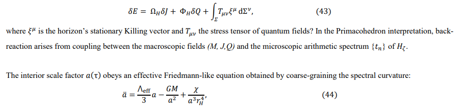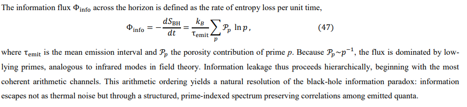The next section extends this geometric framework to black-hole interiors and horizon microstructure, revealing how prime-indexed connectivity generates quantized entropy and porous horizons within the Primacohedron spacetime.