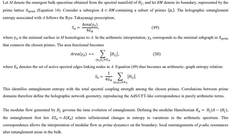 Results: The expanded model unifies arithmetic quantum chaos, random matrix theory, and holography. Temporal fluctuations arise from open p-adic resonances following GUE statistics, while spatial coherence emerges through closed zeta sectors. A curvature–spectral duality defines emergent geometry, black-hole microstructure yields porous horizons, and algorithmic learning saturates the Bekenstein bound dynamically.