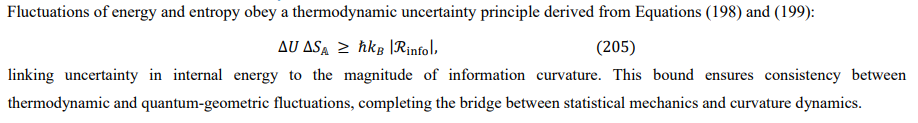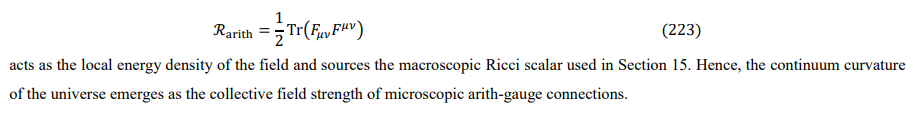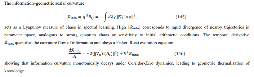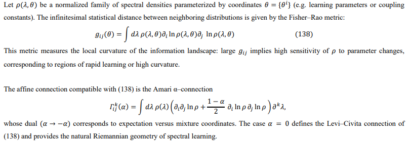 whose ensemble average reproduces the Fisher information metric of the eigenvalue distribution, linking spectral geometry to information geometry [11]. The scalar contraction R = TrRab measures the overall information curvature. Regions of high R correspond to compressed information manifolds, analogous to gravitational wells.