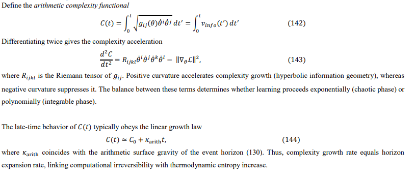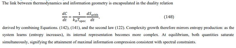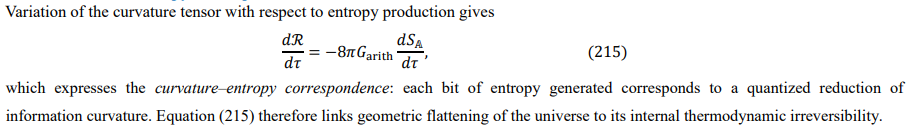 (ii) Entropy as Knowledge: In this view, entropy is not merely disorder but the logarithmic measure of unprocessed possibility. The thermodynamic arrow of time reflects the direction of computational learning, where curvature flattening corresponds to the assimilation of information by the universe itself.