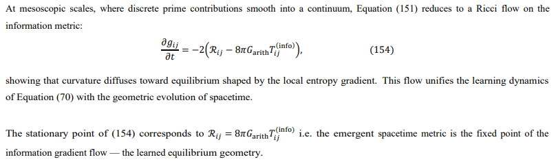 The arithmetic random matrices introduced in Section 3 provide not only a statistical model for the zeros of ζ(s) but also a concrete mechanism for the emergence of geometry from spectral data. In the Primacohedron, spacetime arises as the large-N limit of a prime- weighted random-matrix ensemble whose curvature fluctuations obey a flow reminiscent of the Ricci and information-geometry flows. This section develops the dynamical interpretation of the ensemble measure, its topological dual, and the corresponding spectral- curvature evolution.