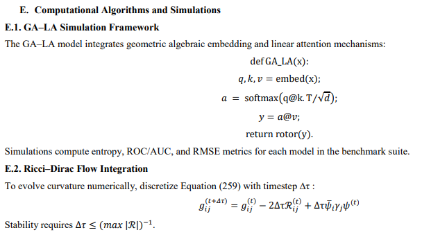 5. Appendix E describes GA–LA and Ricci–Dirac simulation codes;