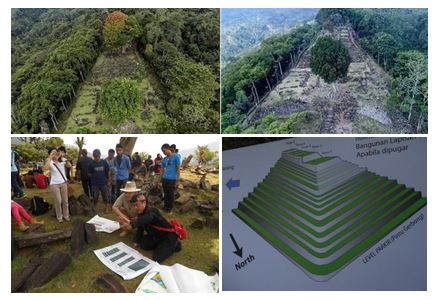 Upper left and right: Aerial views of Gunung Padang, revealing the terraced structure mostly obscured by dense tropical vegetation. Bottom left: Dr. Danny Hilman (center left) discusses excavation layers with Dr. Sam Osmanagich (center right, wearing hat), who visited the site as part of his comparative global pyramid studies. Bottom right: A digital reconstruction model showing the pyramid’s multi-layered stepped design, oriented to the cardinal points and hypothesized to contain at least four distinct cultural phases.