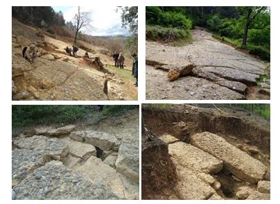 Upper left and right: Large rectangular plates, some weighing several tons, are systematically exposed beneath a thin surface layer of soil and vegetation. The regularity, bonding joints, and placement indicate intentional design and engineering.
